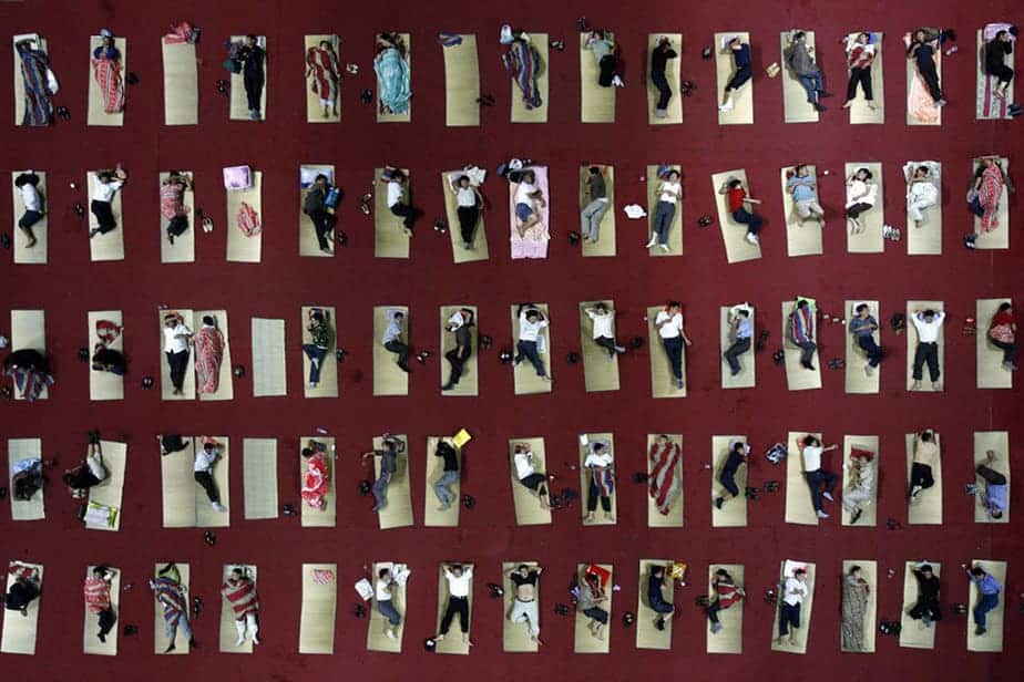 Śpiący studenci na sali w Wuhan.
